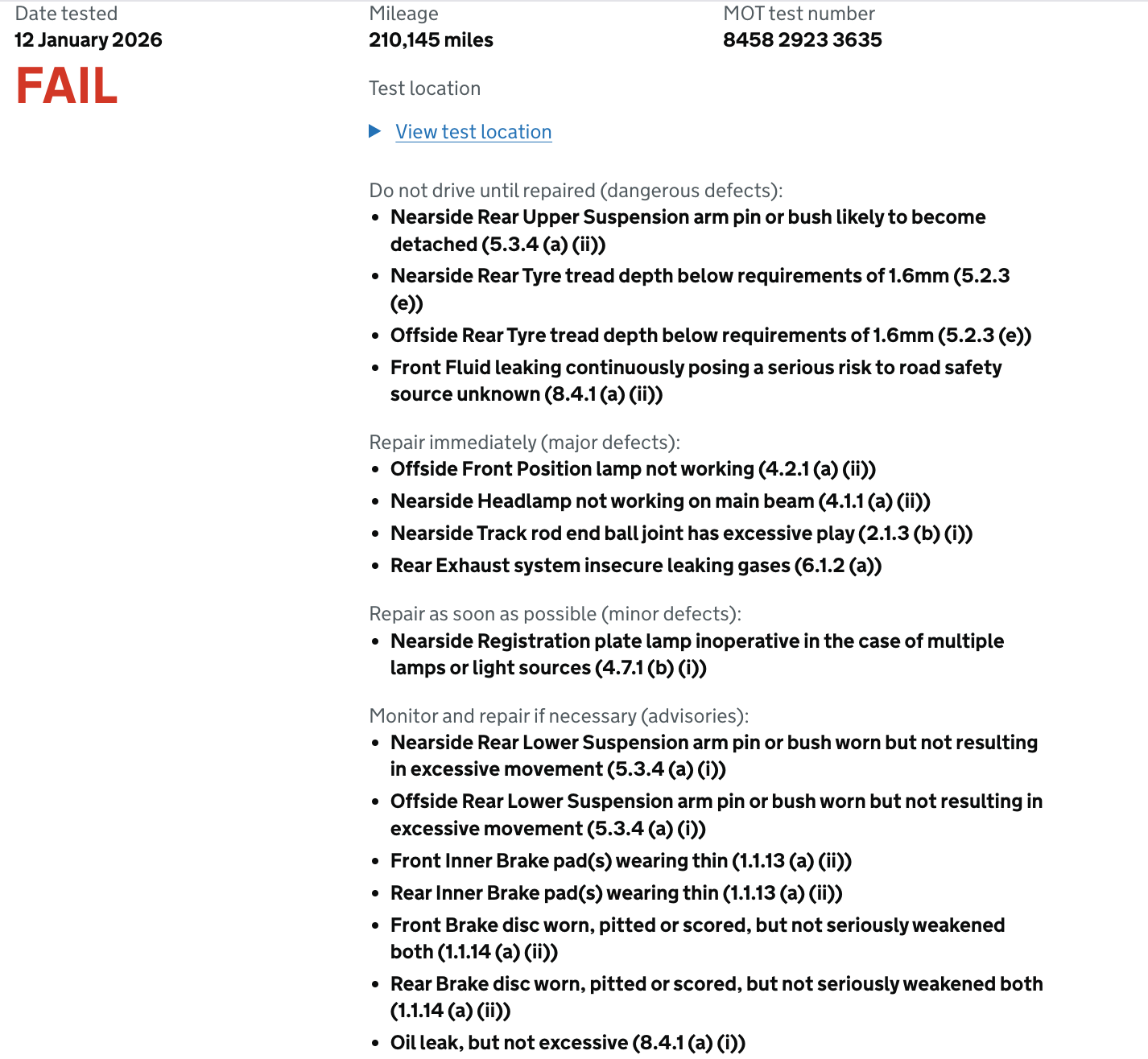 Sorry to hear you're calling time on the car as I know how much you love it. If you get it back to Scotland I would be interested in having a look at the rear arms as there was no indication of a problem when the tracking was checked at the end of June 25. If the wheels were canted in at the top, the alignment check would have picked that up as an out of spec camber measurement. Apart from the fluid leak the other things are easily fixed, although discs, pads and tyres are not cheap these days. |